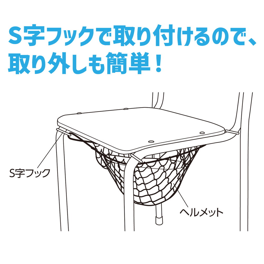 四隅のフックを掛けるだけで椅子の下にヘルメットを保管・常備できる