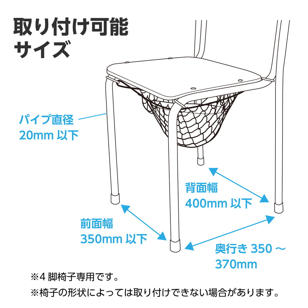 | 注意事項 | 取付可能サイズ:椅子の足パイプ20mm以下,前面約350mm,背面約400mm,奥行約350~370mm(4脚椅子に限る)※椅子の形状によっては取付できない可能性があります。※ヘルメットは別売です※ |