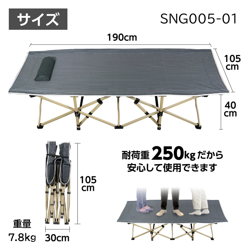 | サイズ | SNG005-01 展開時/W1900×D1050×H400mm、収納時/W300×D170×H1050mm 重量:7.8kg 耐荷重:250kg SNG005-02 展開時/W1900×D670×H350mm、収納時/W250×D180×H1050mm 重量:5.7kg 耐荷重:100kg |