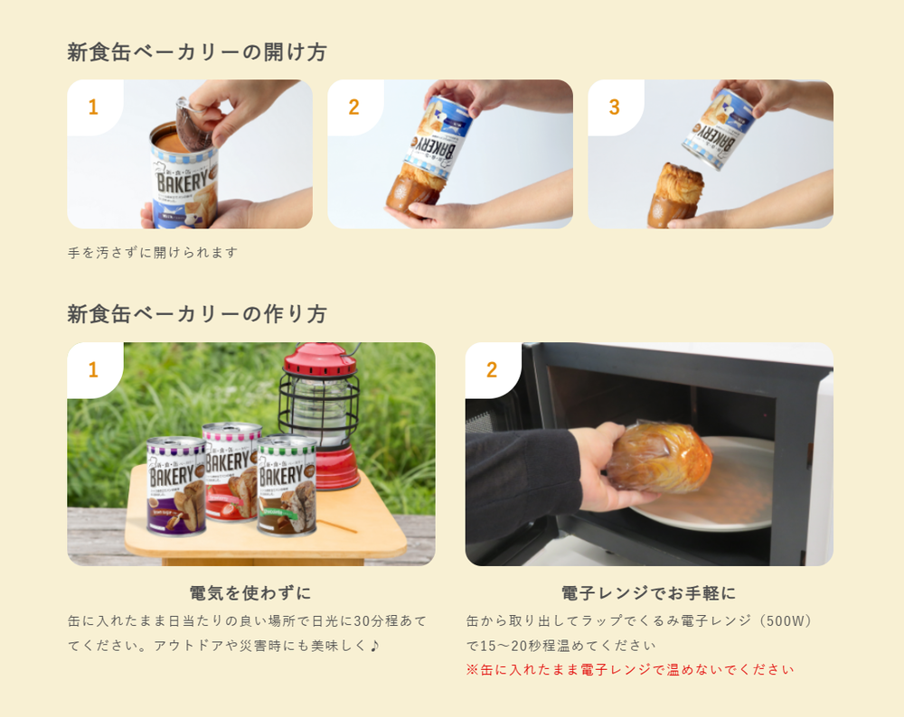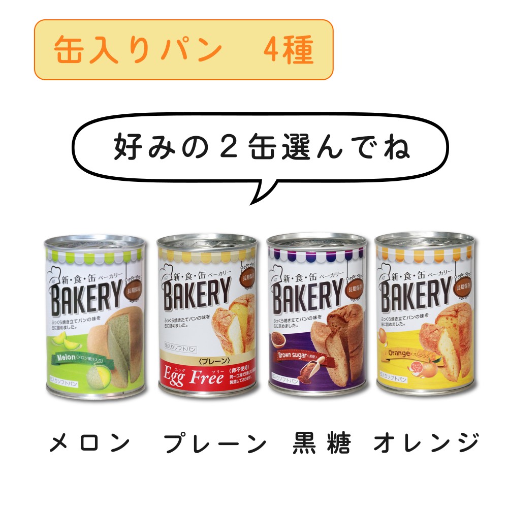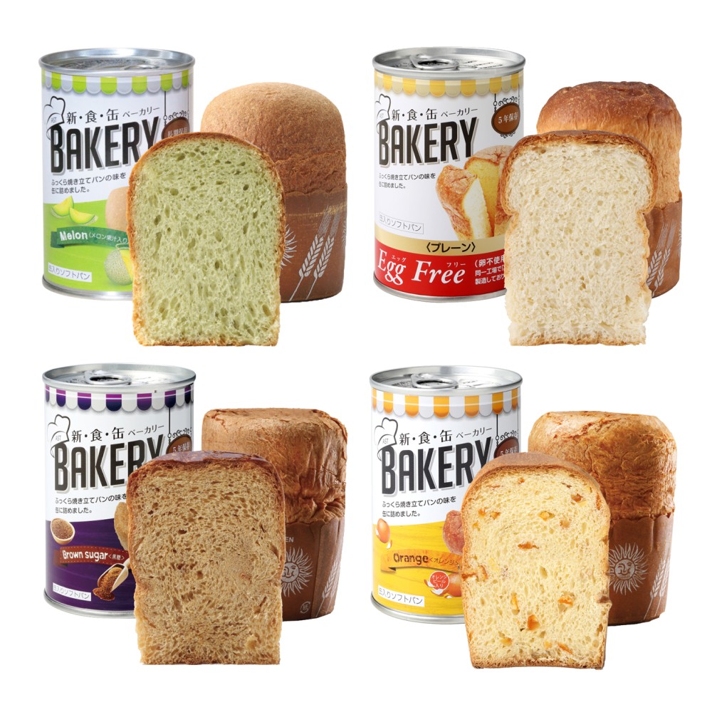 | 商品特徴 | 缶入りパン:新食缶ベーカリー メロン、プレーン、黒糖、オレンジ |