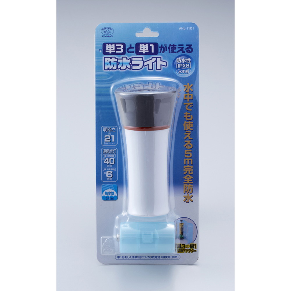 コンパクトサイズの完全防水ライト。豪雨でも使えるIPX8完全防水仕様。乾電池1本で光るので電池の節約にもなります。電池交換アダプター付で単3形、単1形アルカリ乾電池どちらも使用可能。 電池寿命 単1形乾電池で約40時間 単3形電乾電池で約6時間(国内メーカー製アルカリ乾電池使用時)